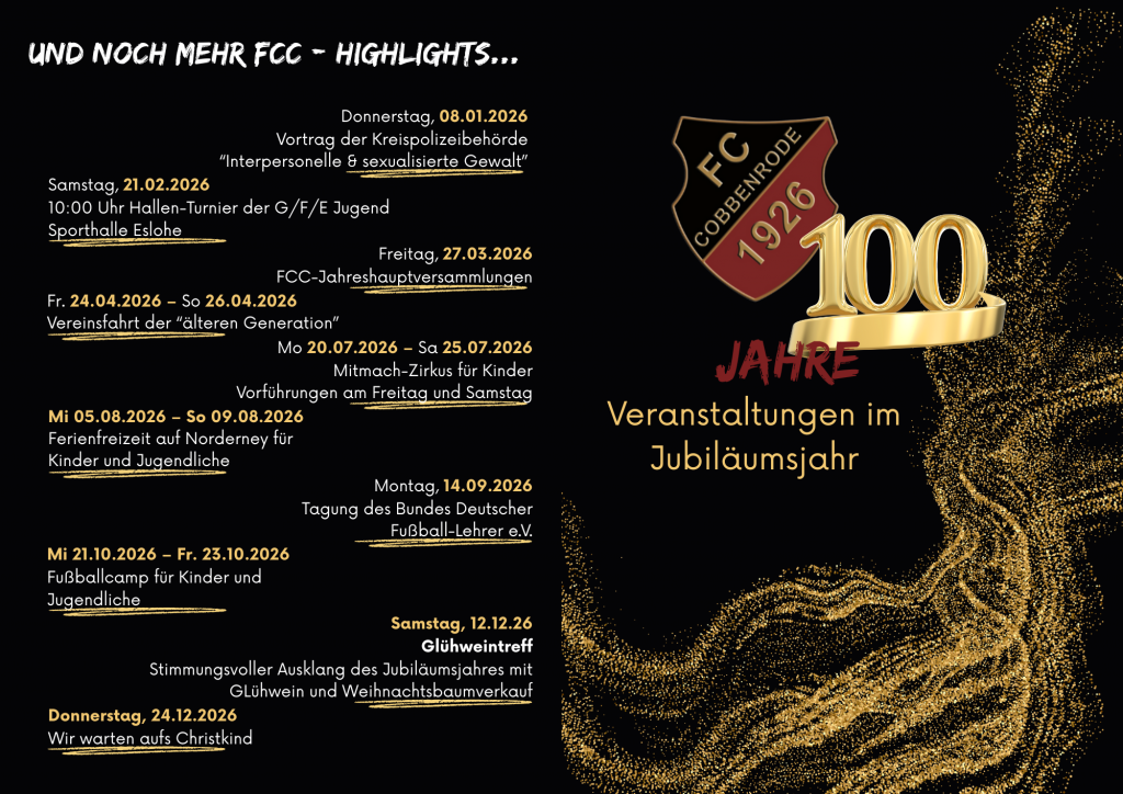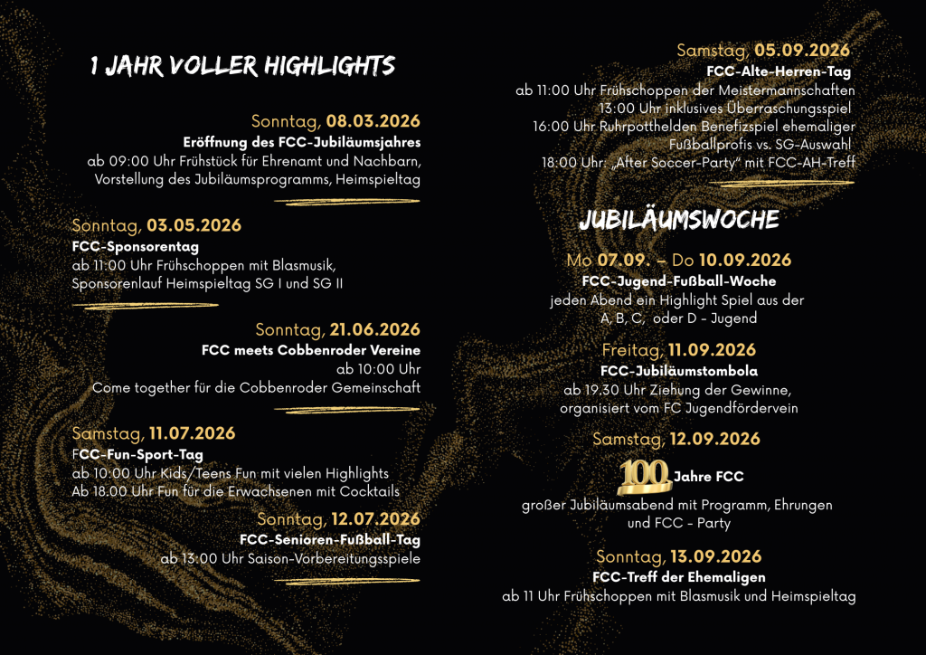 In diesem Jahr feiern wir mit euch 100 Jahre FC Cobbenrode. Wir laden euch ein, ein Stück Geschichte von uns in Cobbenrode mitzufeiern. Bei vielen Gelegenheiten das ganze Jahr über werden wir Geschichte erzählen und ein Stück neu schreiben.